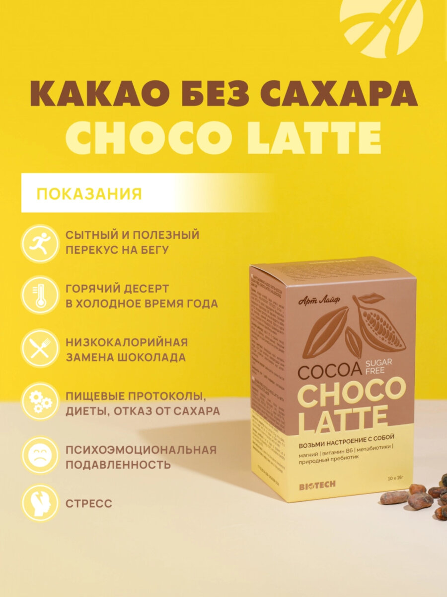 10 цен на Какао БЕЗ САХАРА «Шоко латтэ» со вкусом белого шоколада, Арт Лайф, 10 саше по 15 гр.