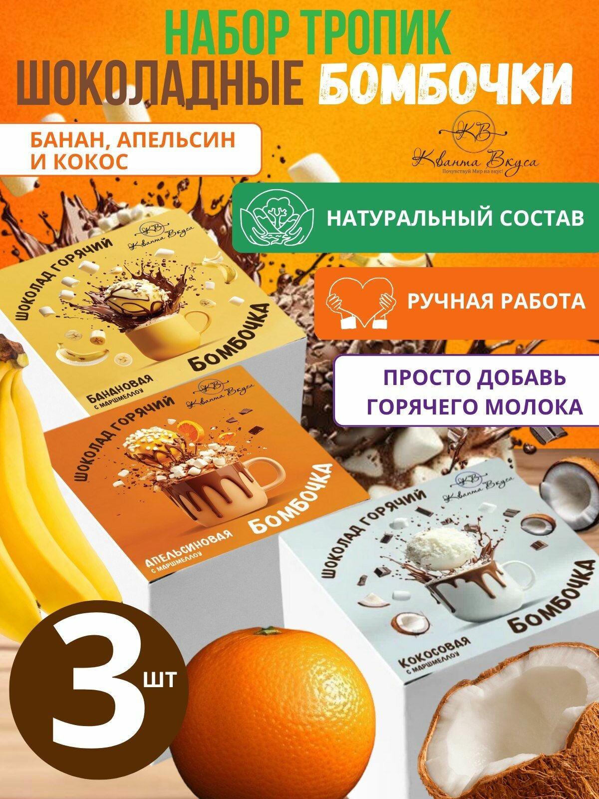 Шоколадные бомбочки Тропик (банан, апельсин, кокос) информация: