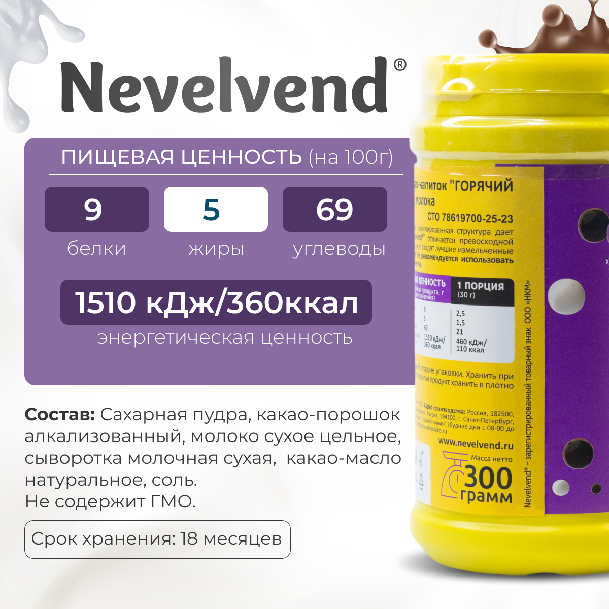 Сухой гранулированный быстрорастворимый какао-напиток «ГОРЯЧИЙ ШОКОЛАД» «NEVELVEND®» классический на основе молока информация: