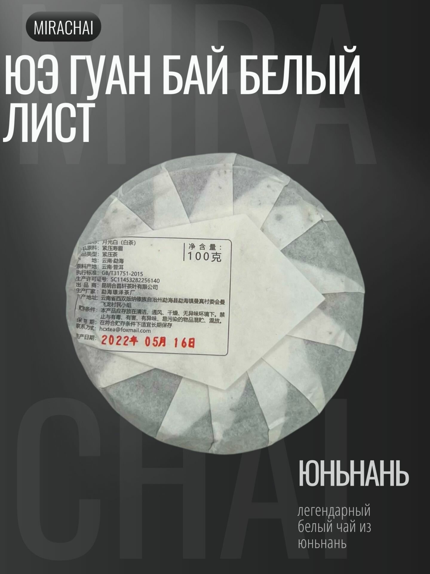 Белый чай из Юньнань Юэ Гуан Бай "Белый лист" блин 100 грамм/ 2022 год информация: