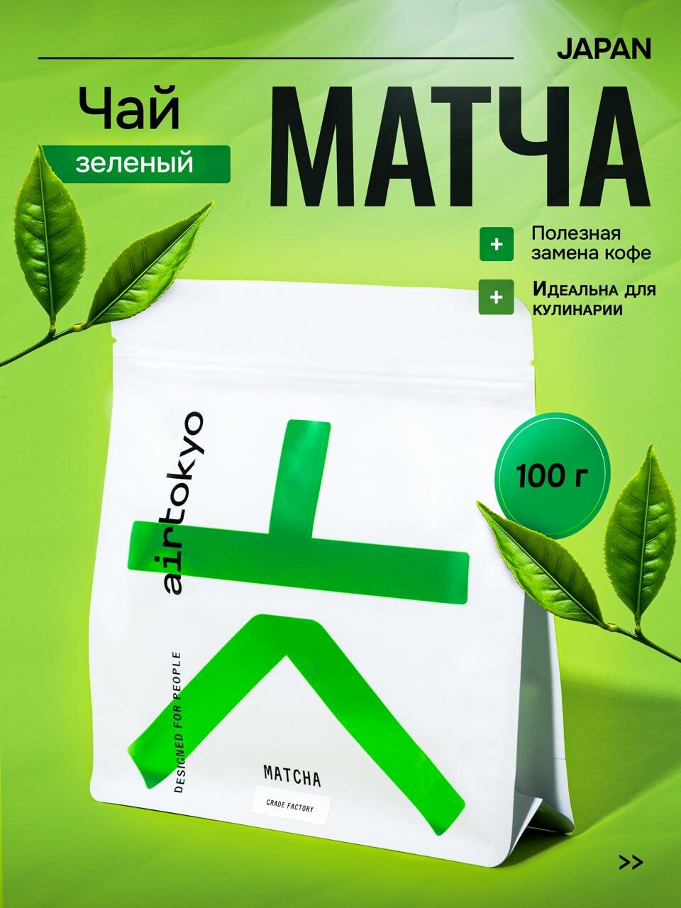Японский зеленый чай матча AirTokyo 100 грамм, кулинарный грейд, натуральный порошковый растворимый напиток информация: