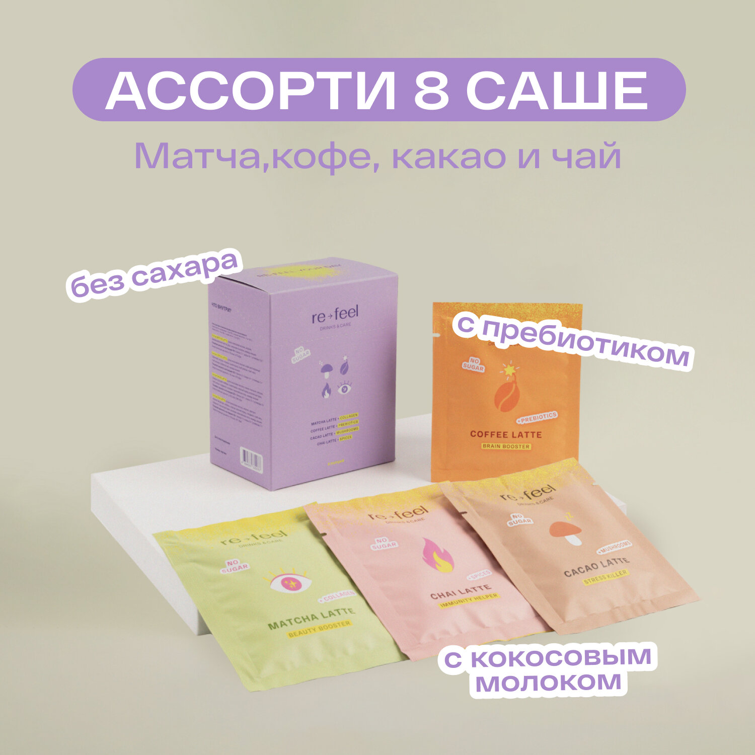 Отзывы на Ассорти набор напитков re-feel чай матча, чай масала, какао и кофе 8 саше