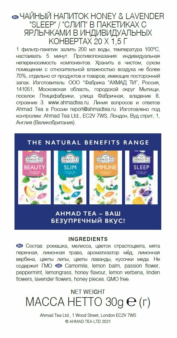 Чайный напиток "Ahmad Tea", Слип, пакетики с ярлычками в индивидуальных конвертах, 20х1,5г информация: