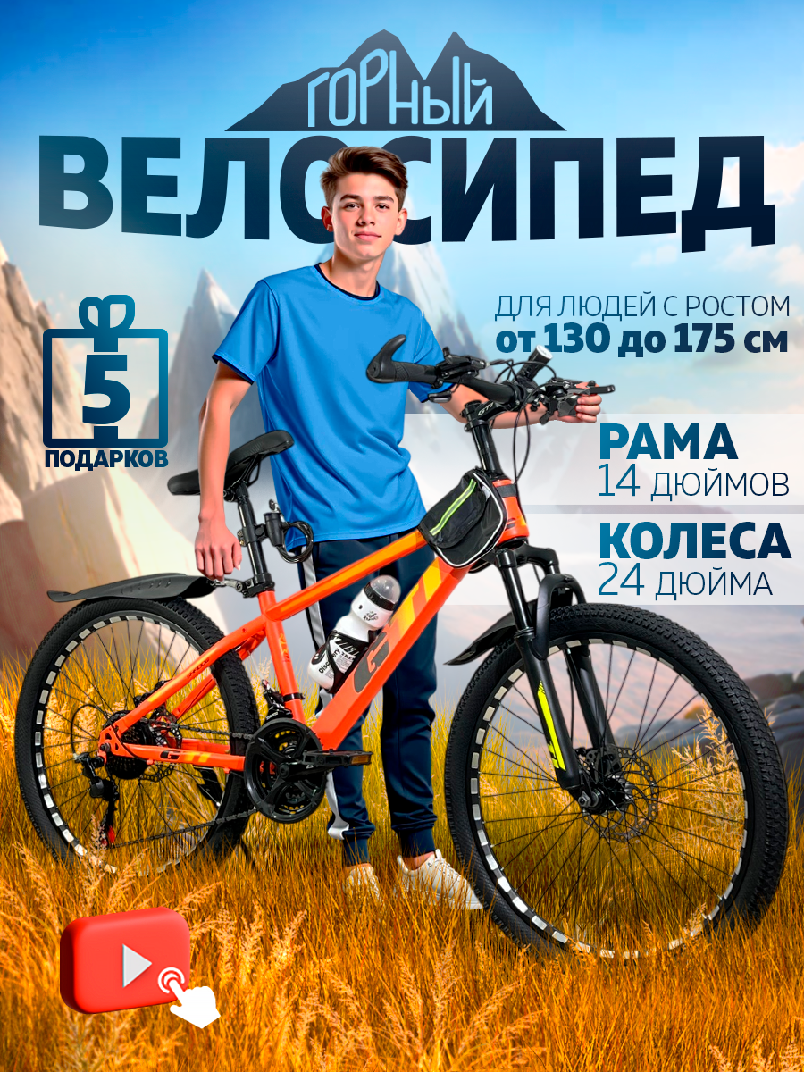 Горный велосипед SUN 21s, скоростной, универсальный, сталь, 24", 12,1 кг, оранжевый 17 919 ₽