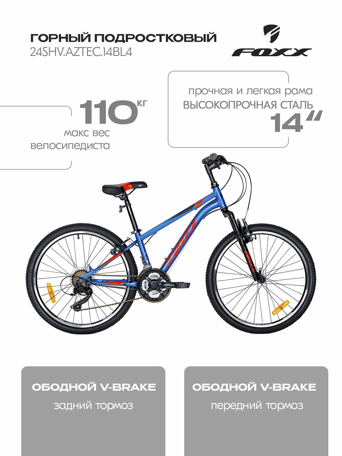 Велосипед FOXX AZTEC, стальной, 6 скоростей, диаметр колес 24", рама 14 дюймов информация: