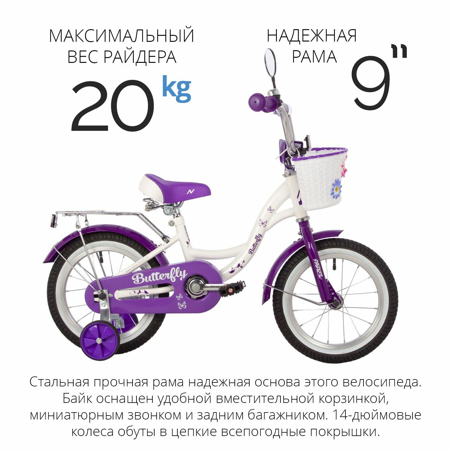 10 цен на Велосипед NOVATRACK 14" BUTTERFLY белый-фиолетовый, тормоз ножной , крылья и багаж хромированые , корзина