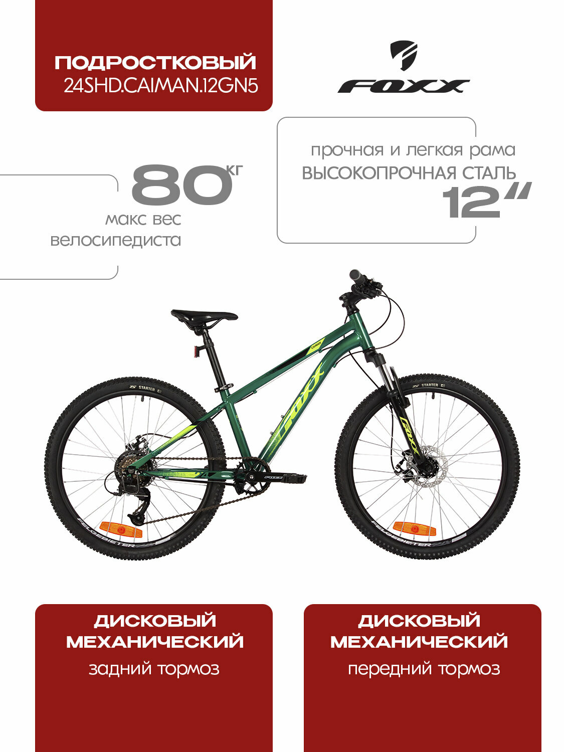 Велосипед горный подростковый FOXX 24" CAIMAN JR двухколесный, зеленый информация: