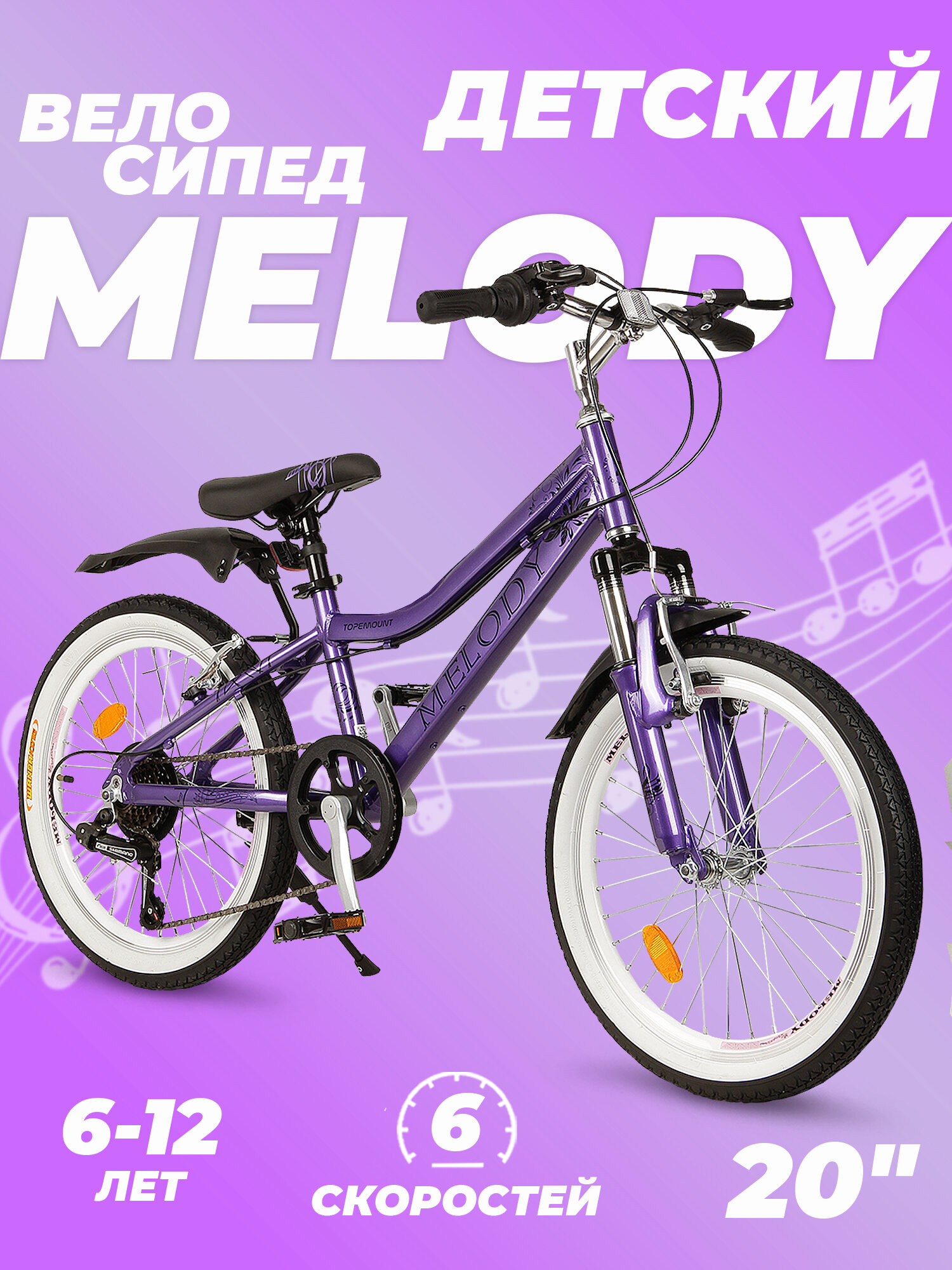 Горный велосипед детский скоростной Melody 20" фиолетовый, 6-12 лет, 6 скоростей (Shimano tourney) информация: