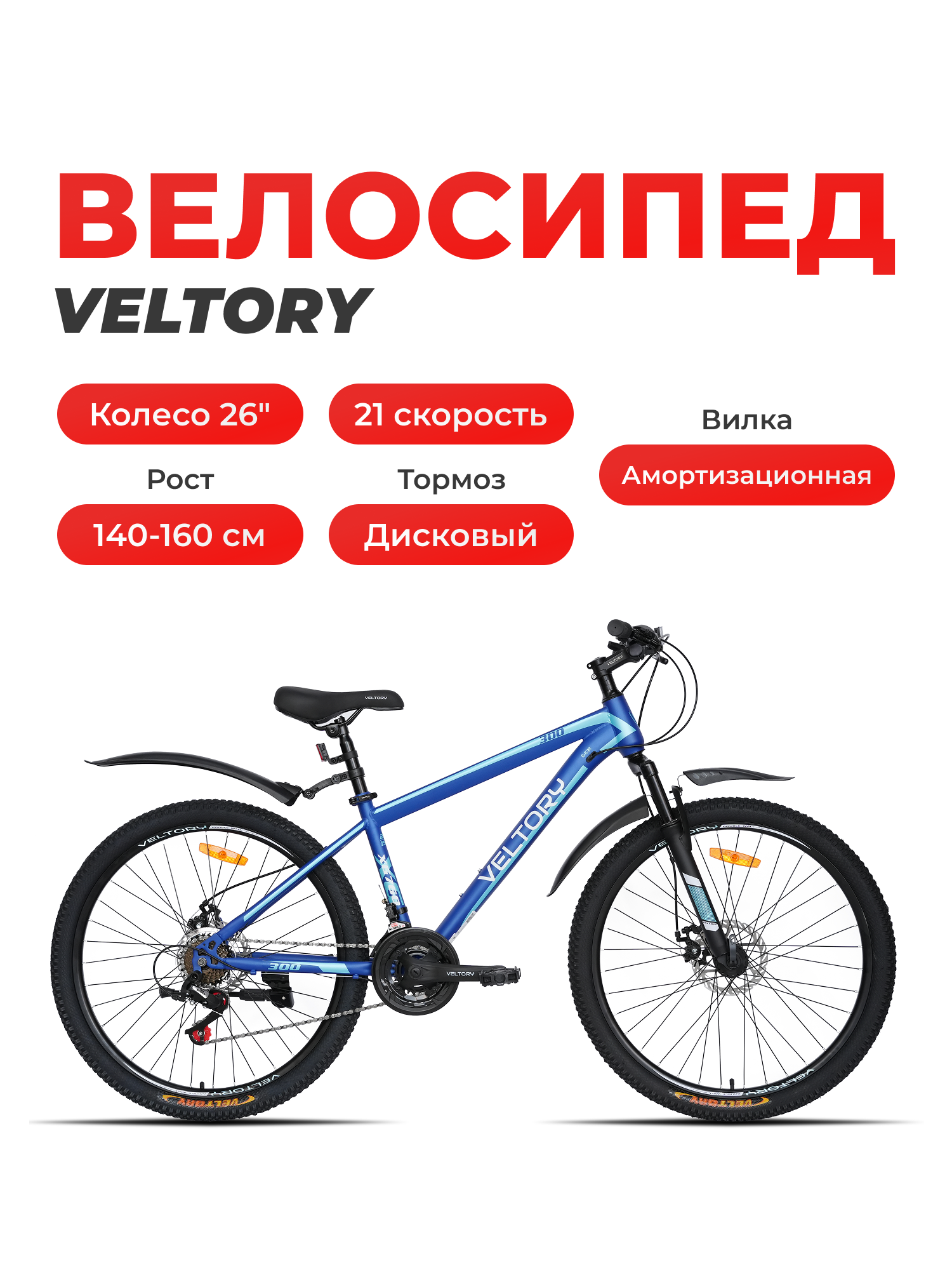 Велосипед горный VELTORY, модель 26D-300 синий, 15 рама, 21 скорость информация: