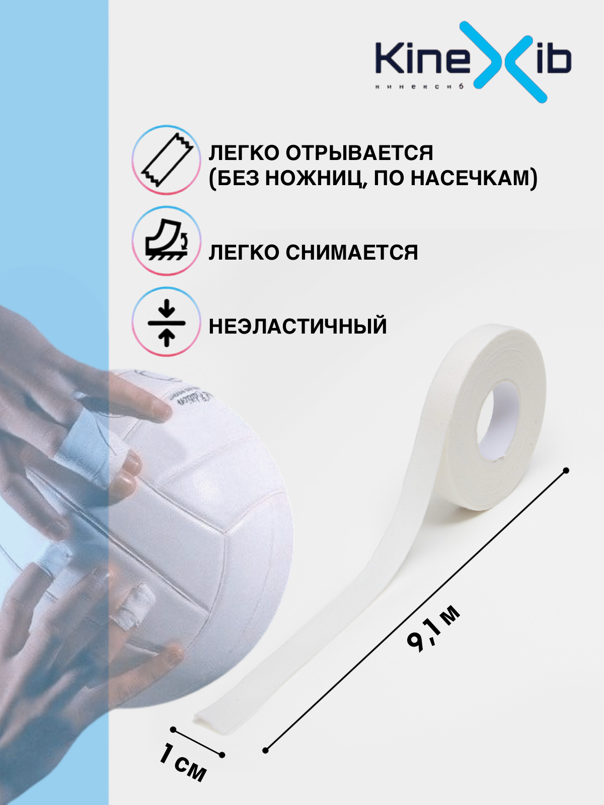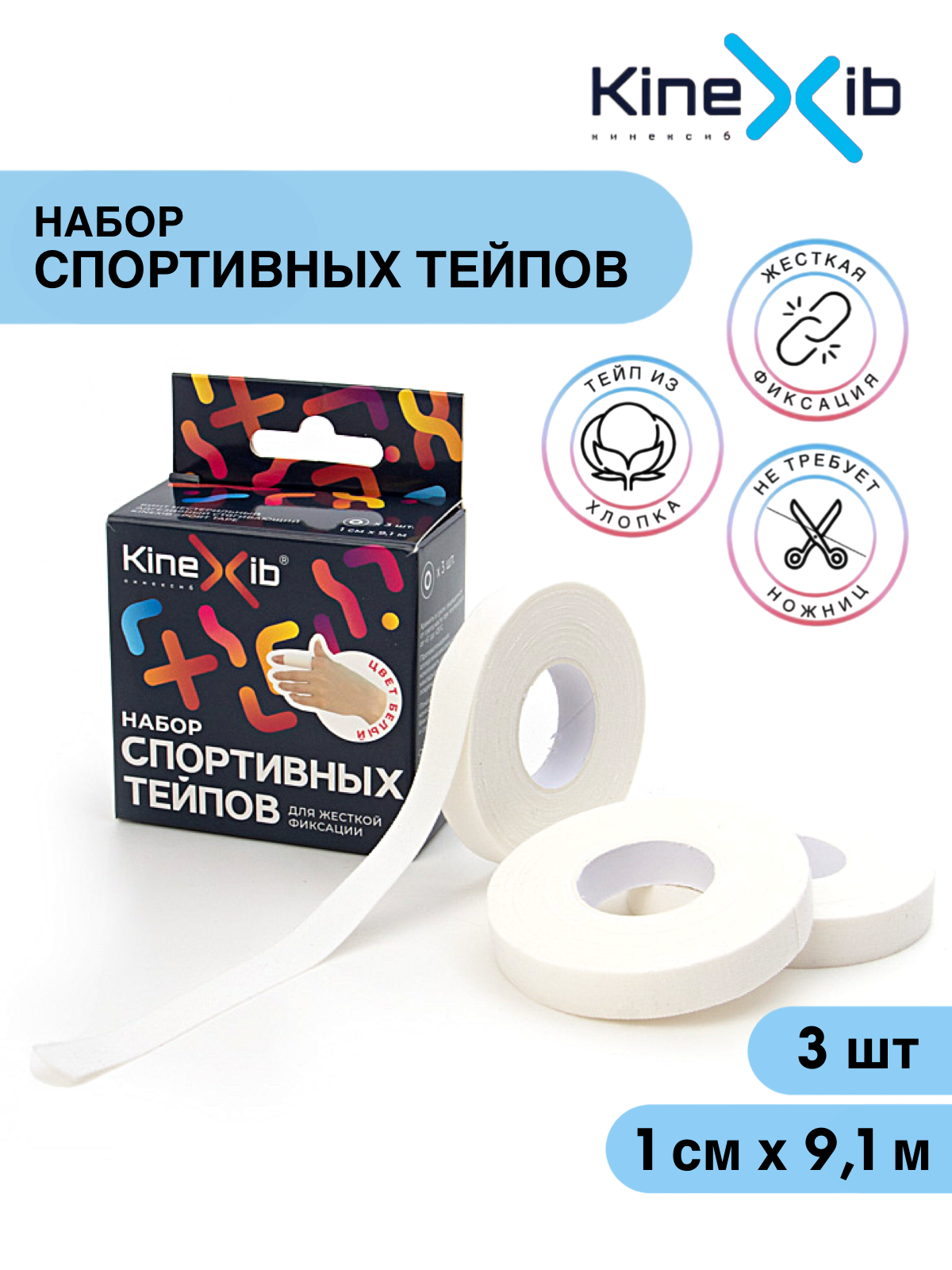 Спортивный бинт Kinexib Sport tape, для жесткой фиксации, неэластичный 9.1м*1см(3 штуки), белый информация:
