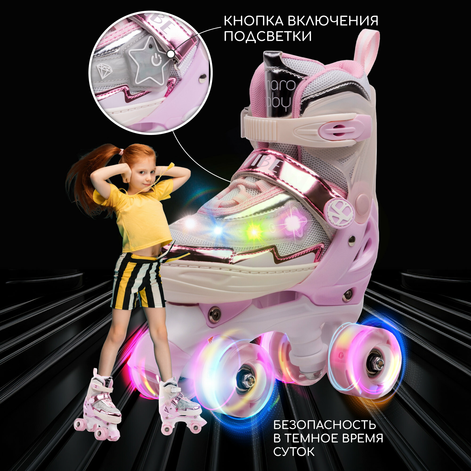 Ролики Amarobaby Glory раздвижные со светящимися колесами, бежевый/розовый, размер 30-33 информация: