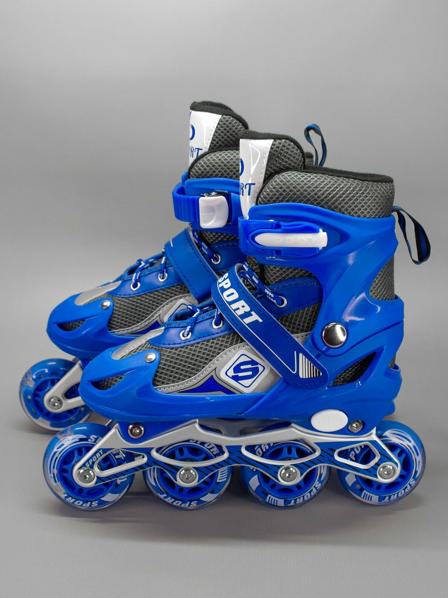 Синие раздвижные роликовые коньки, шлем, защита коленей, локтей, кистей, сумка, размер 31-34 информация: