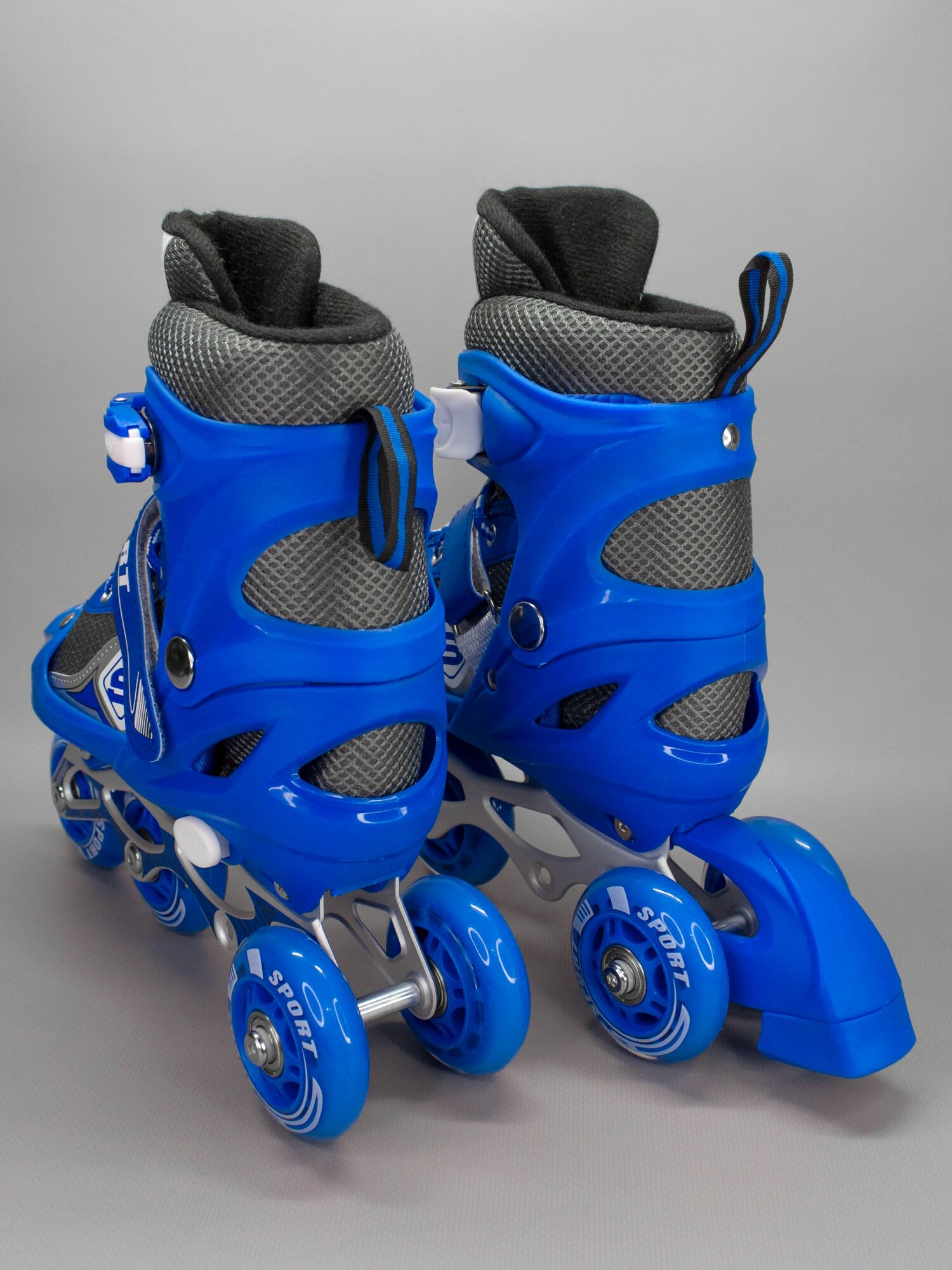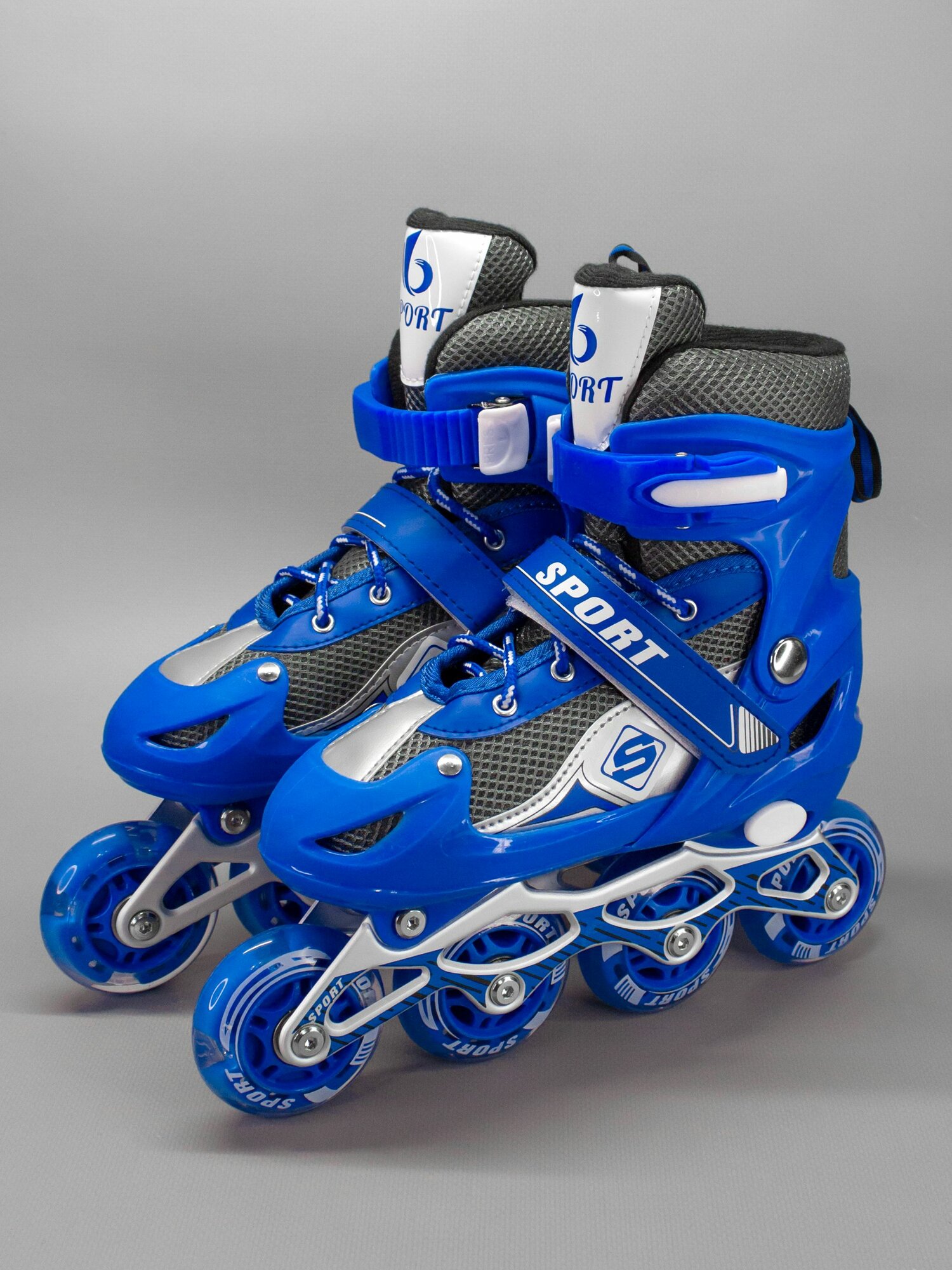 Синие раздвижные роликовые коньки, шлем, защита коленей, локтей, кистей, сумка, размер 31-34 4 240 ₽