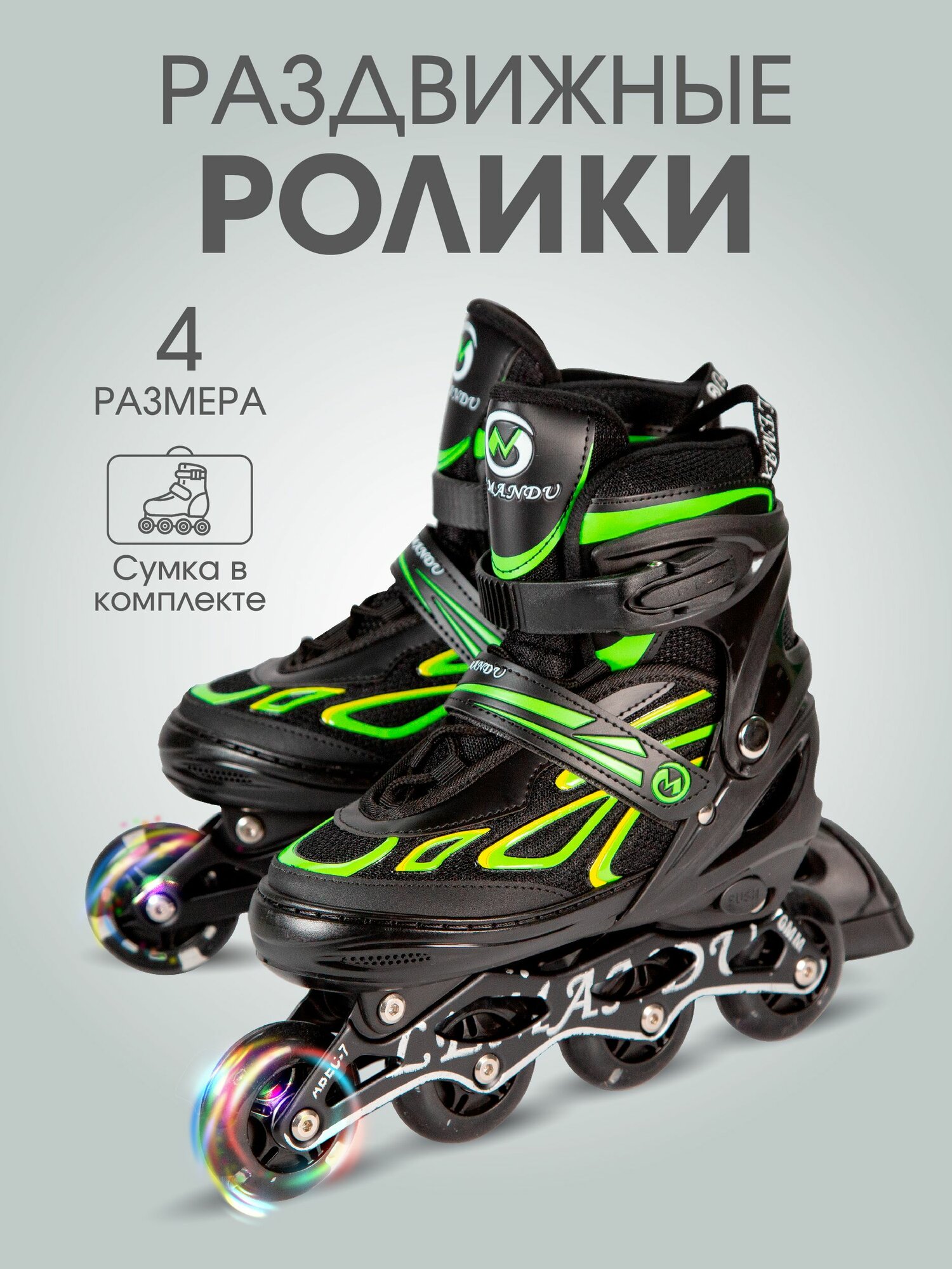 10 цен на Коньки роликовые в сумке, раздвижные светящиеся размер 33-36, черно-зеленые
