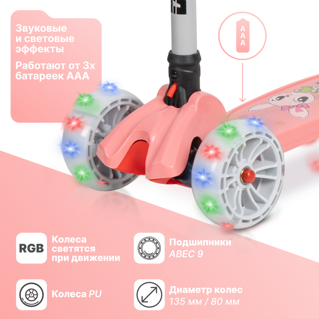 Самокат детский Costa FF252, трехколесный, складной, с регулировкой руля, с подсветкой, розовый информация: