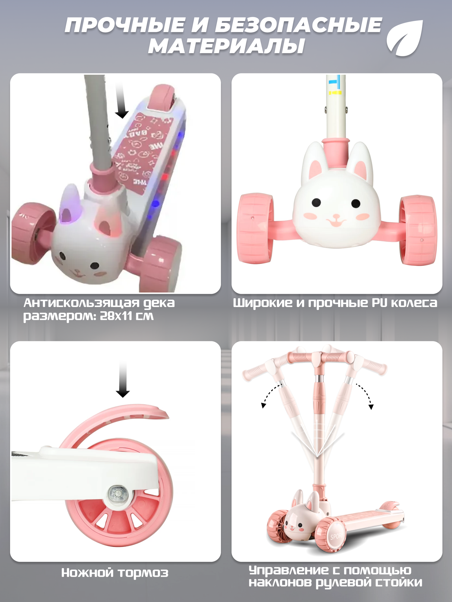 Детский трехколесный самокат до 30 кг, PU колеса 75 - 100 мм, высота ручки 67-77 см, светящиеся колеса и платформа, музыка 3 609 ₽