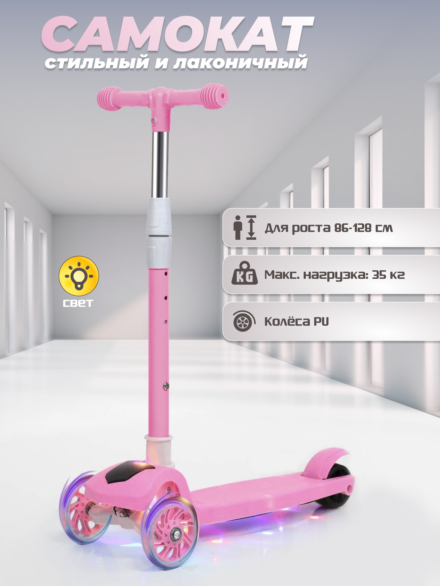 Детский трехколесный самокат до 30 кг, PU колеса 75 - 100 мм, высота ручки 67-77 см, светящиеся колеса и платформа, музыка 3 609 ₽