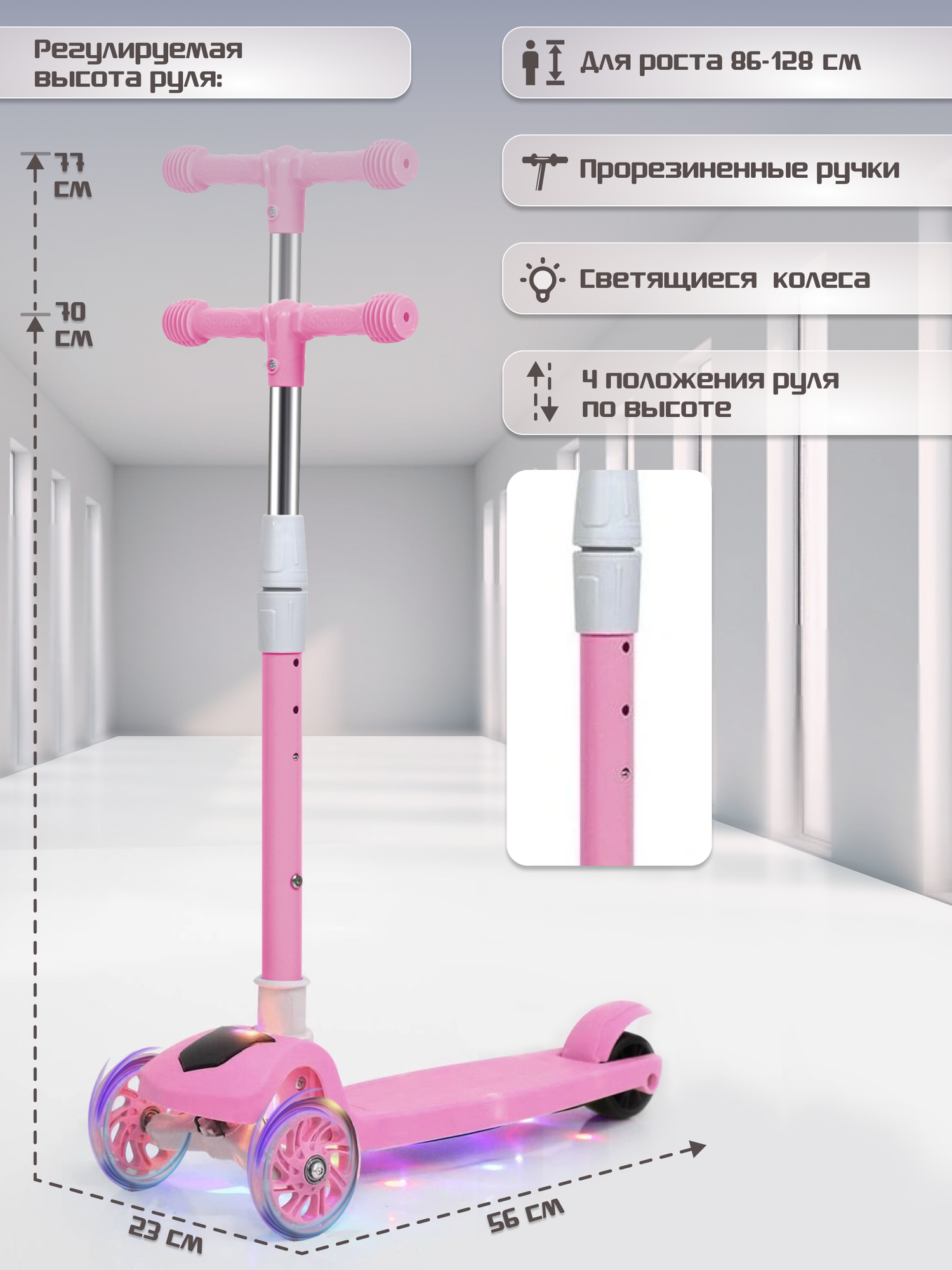 Детский трехколесный самокат до 40 кг, светящиеся PU колеса 70 - 115 мм, высота ручки 81 - 90 см 3 689 ₽