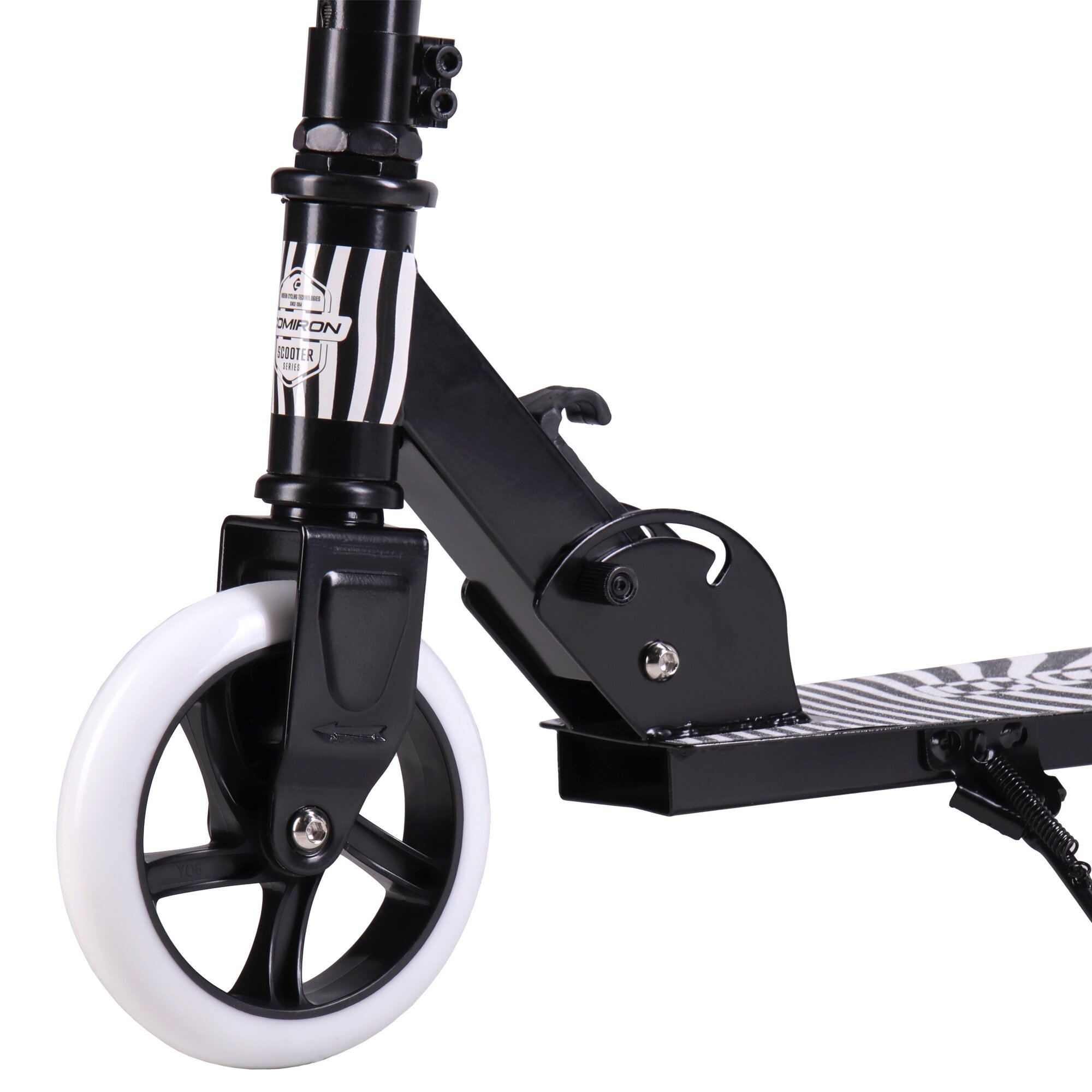 10 цен на Самокат двухколесный складной для девочки для мальчика детский COMIRON Zebra, колеса PU 145 мм, дека 510х120 мм, подножка, складной механизм, цвет черный с белым / 1 шт.