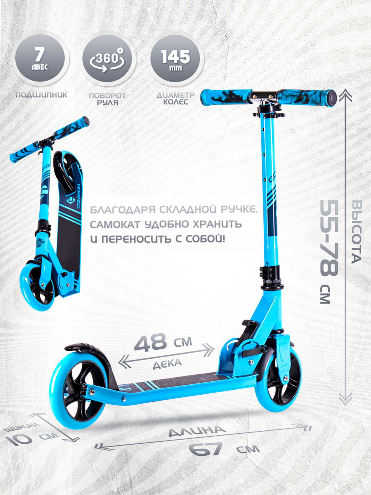 Самокат двухколесный складной городской COMIRON "Навстречу ветру" Classic, алюминиевая дека 48х10 см, большие полиуретановые колеса 14,5 см, регулируемый руль, светло-синий / 1 шт. информация: