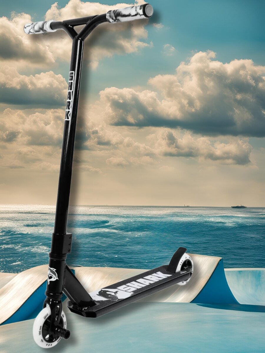 Трюковой самокат ATEOX Shark, черно-белый,100 мм, двухколесный, до 165 см, от 6+, до 100 кг, для подростков информация: