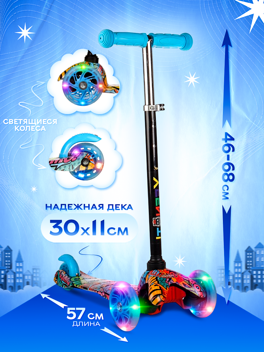 Самокат детский трехколесный COMIRON Yeenot Kids "Граффити-2", регулируемая ручка, светящиеся колеса 110 и 75 мм, нагрузка до 30 кг, ABEC 7, разноцветный / 1 шт. информация: