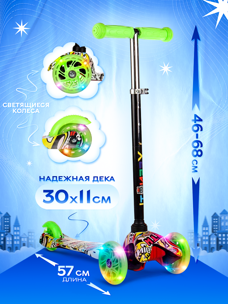 Самокат детский трехколесный COMIRON Yeenot Kids "Граффити-1", регулируемая ручка, светящиеся колеса 110 и 75 мм, нагрузка до 30 кг, ABEC 7, разноцветный / 1 шт. 2 099 ₽
