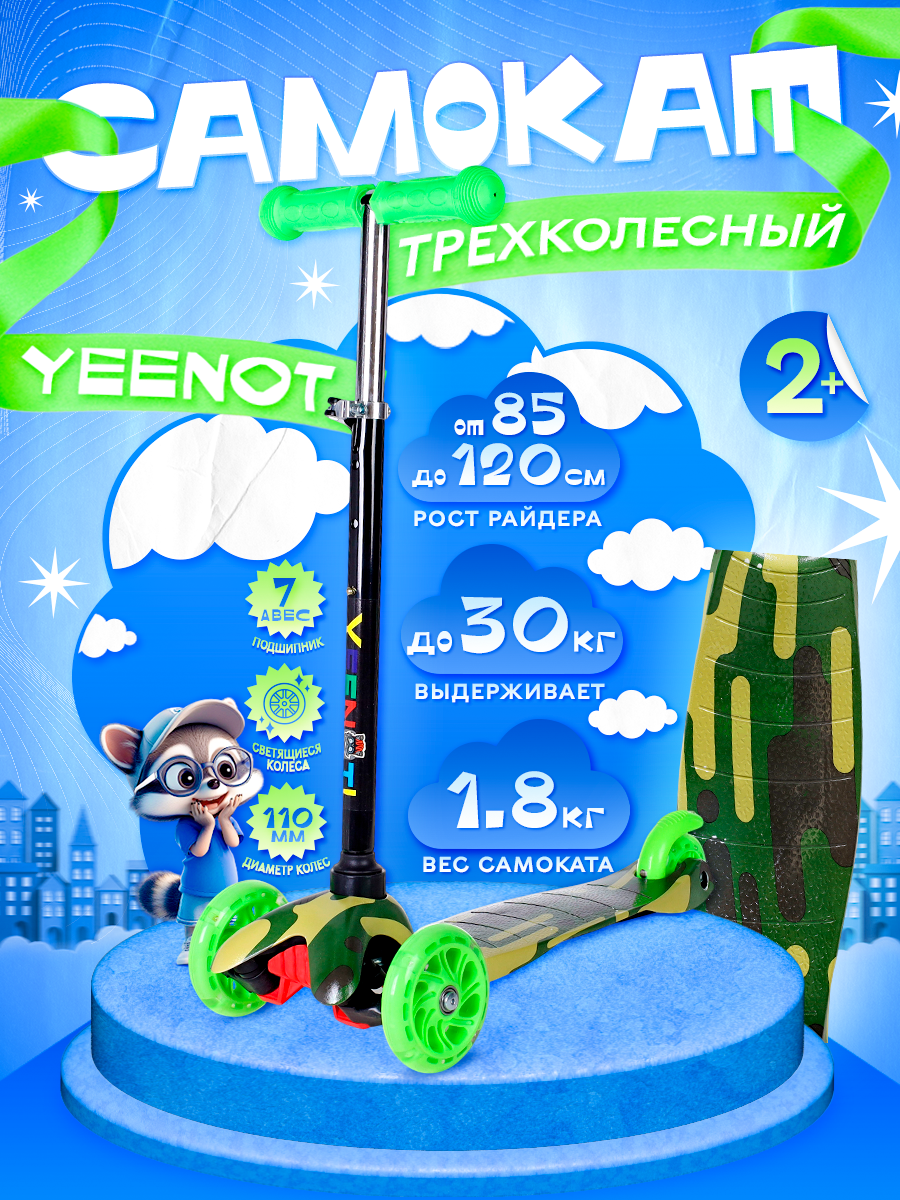 Самокат детский трехколесный COMIRON Yeenot Kids "Хаки", регулируемая ручка, светящиеся колеса 110 и 75 мм, нагрузка до 30 кг, ABEC 7, разноцветный / 1 шт. информация: