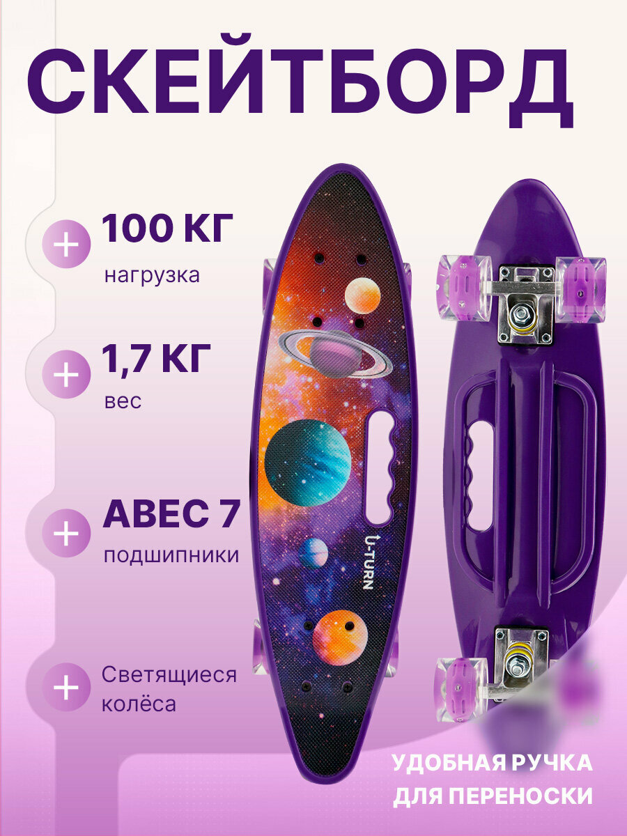 Скейтборд-Пенниборд, основа алюминий, 59х16.5х12 см, светящиеся колеса PU 60х45 мм, фиолетовый, космос информация: