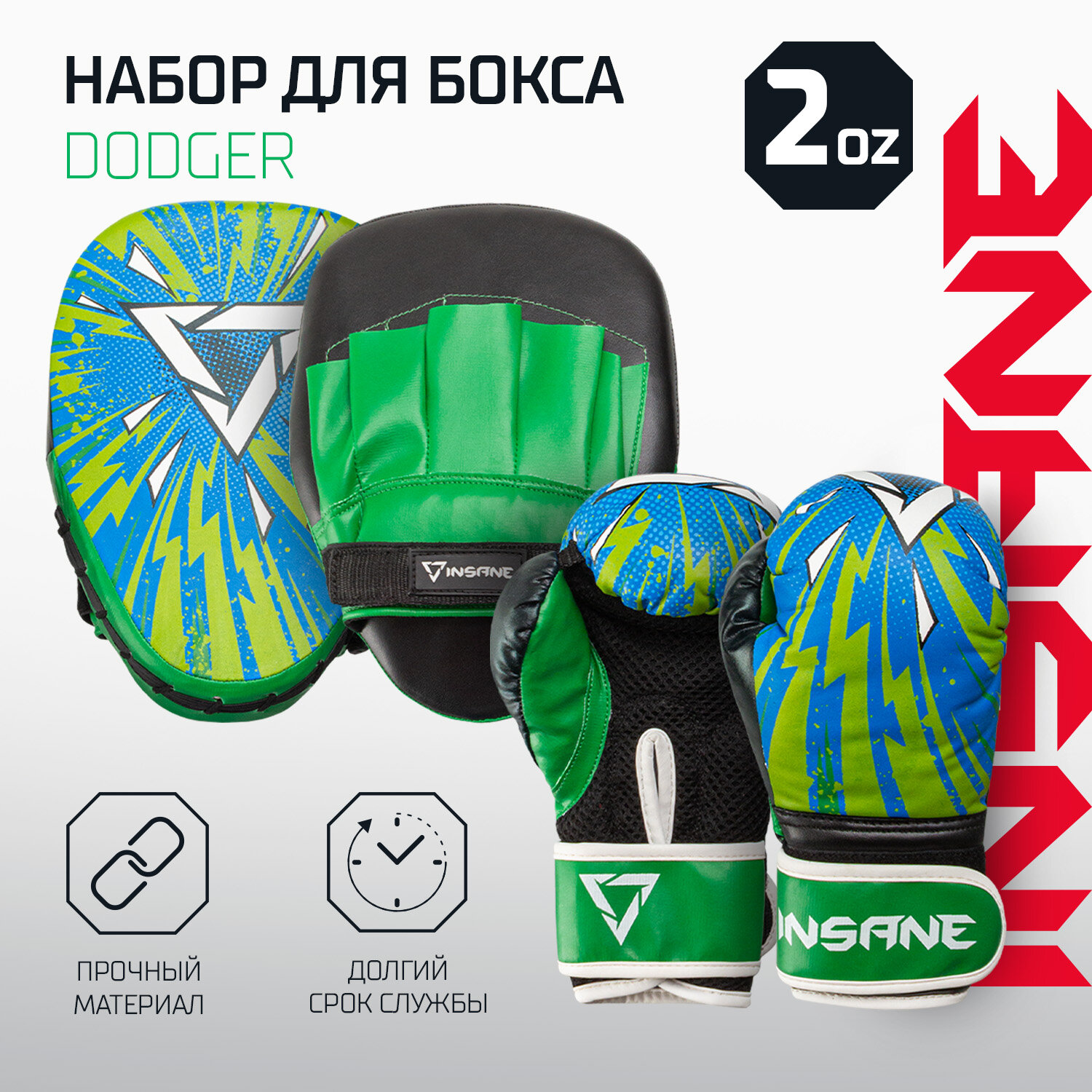 Набор для бокса INSANE DODGER детский. Боксерские перчатки 2 OZ, лапы 23x17 см, цвет синий/зеленый информация: