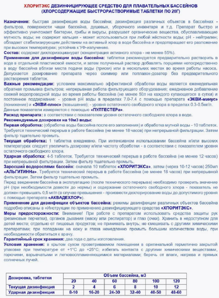 Хлоритэкс для бассейна 4 кг, таблетки дезинфекции и очистки воды информация: