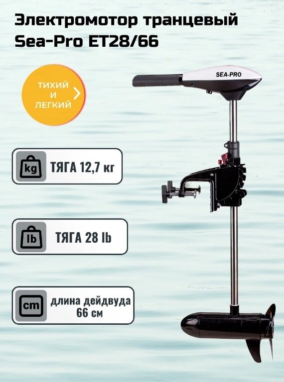 10 цен на Электромотор Sea-Pro ET28/66, тяга : 28Lb / 12.7кг, под аккумулятор 12В, черный, скорости: 5 вперед / 2 назад