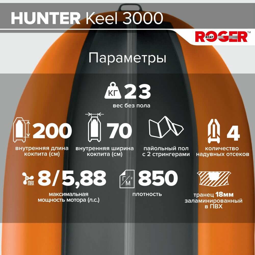 Лодка надувная ПВХ под мотор ROGER Hunter Keel 3000, лодка роджер с жестким дном (графитовый-оранжевый комбинированный) информация:
