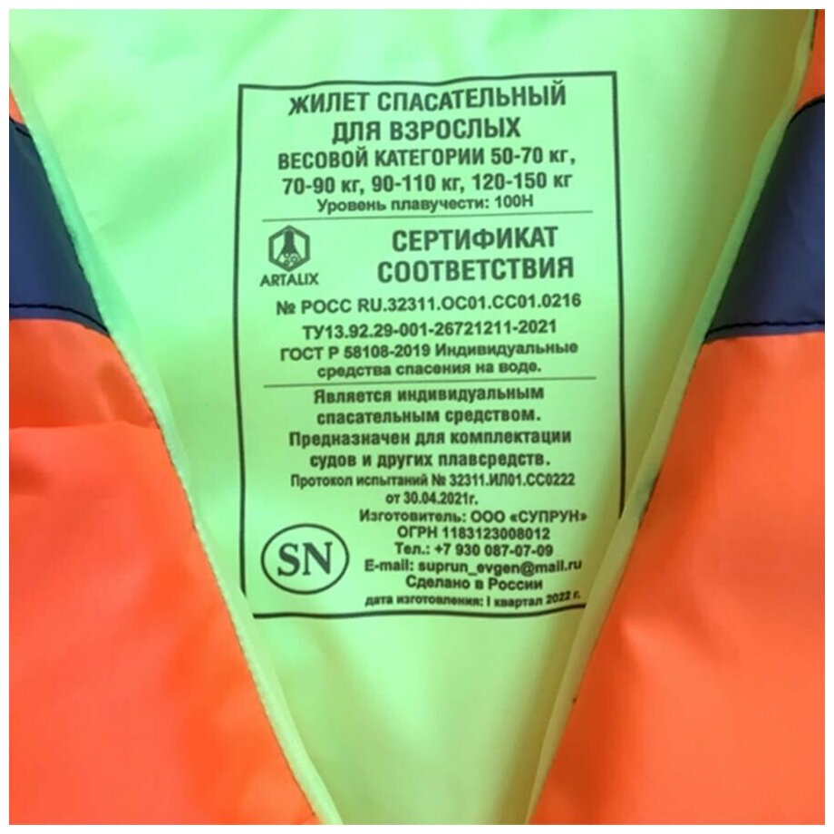 Жилет спасательный сертифицированный Forest river (90-110 кг) информация: