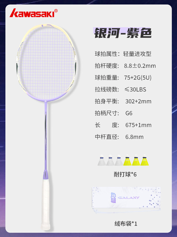 Бадминтонная ракетка Kawasaki Galaxy, женская, 5U, фиолетовая, углерод-алюминий информация: