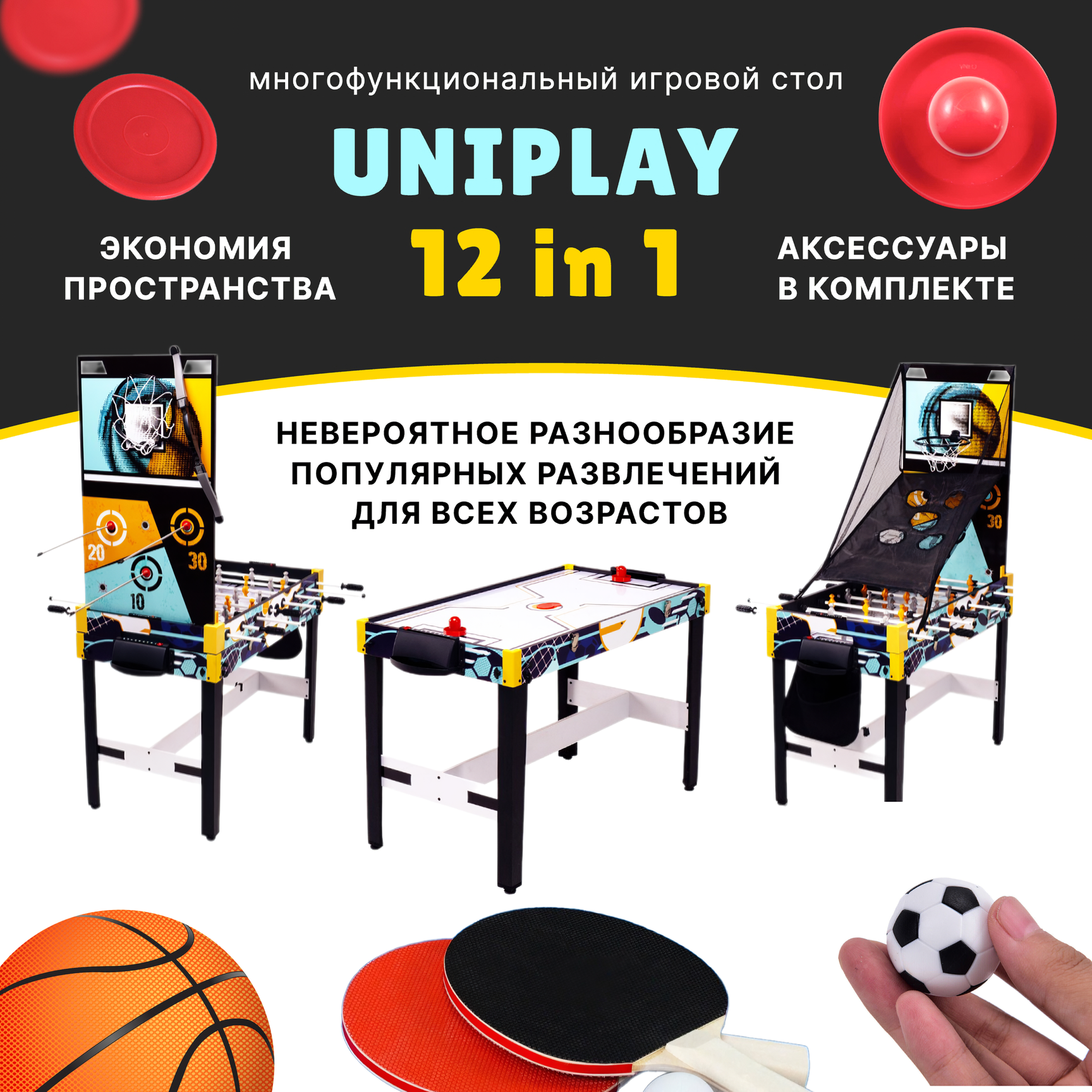 Игровой стол - трансформер 12 в 1 "UniPlay", баскетбол, настольный футбол, аэрохоккей информация: