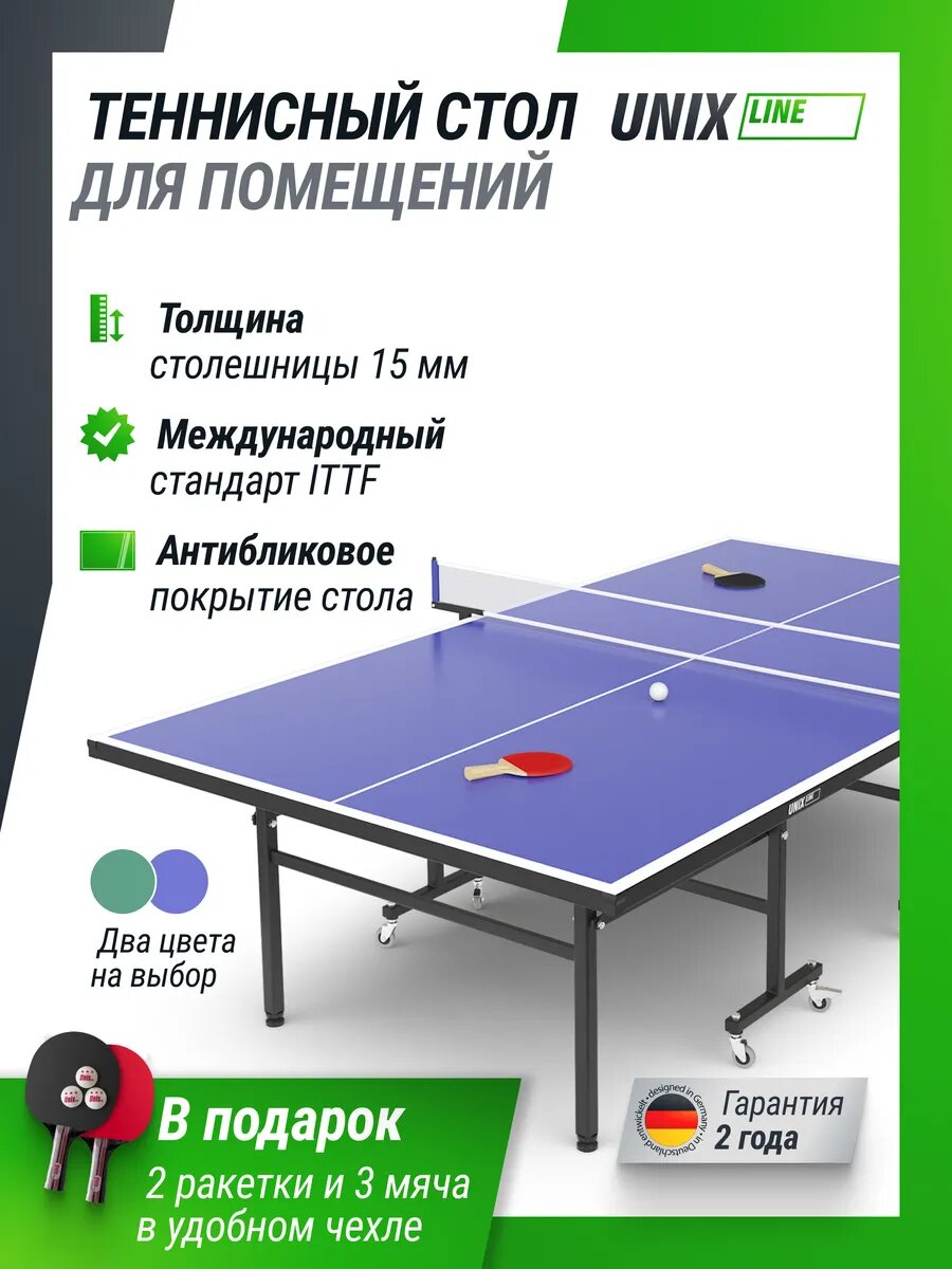 Теннисный стол UNIX Line Indoor 15 mm MDF (Blue), 2 ракетки, 3 шарика в комплекте информация: