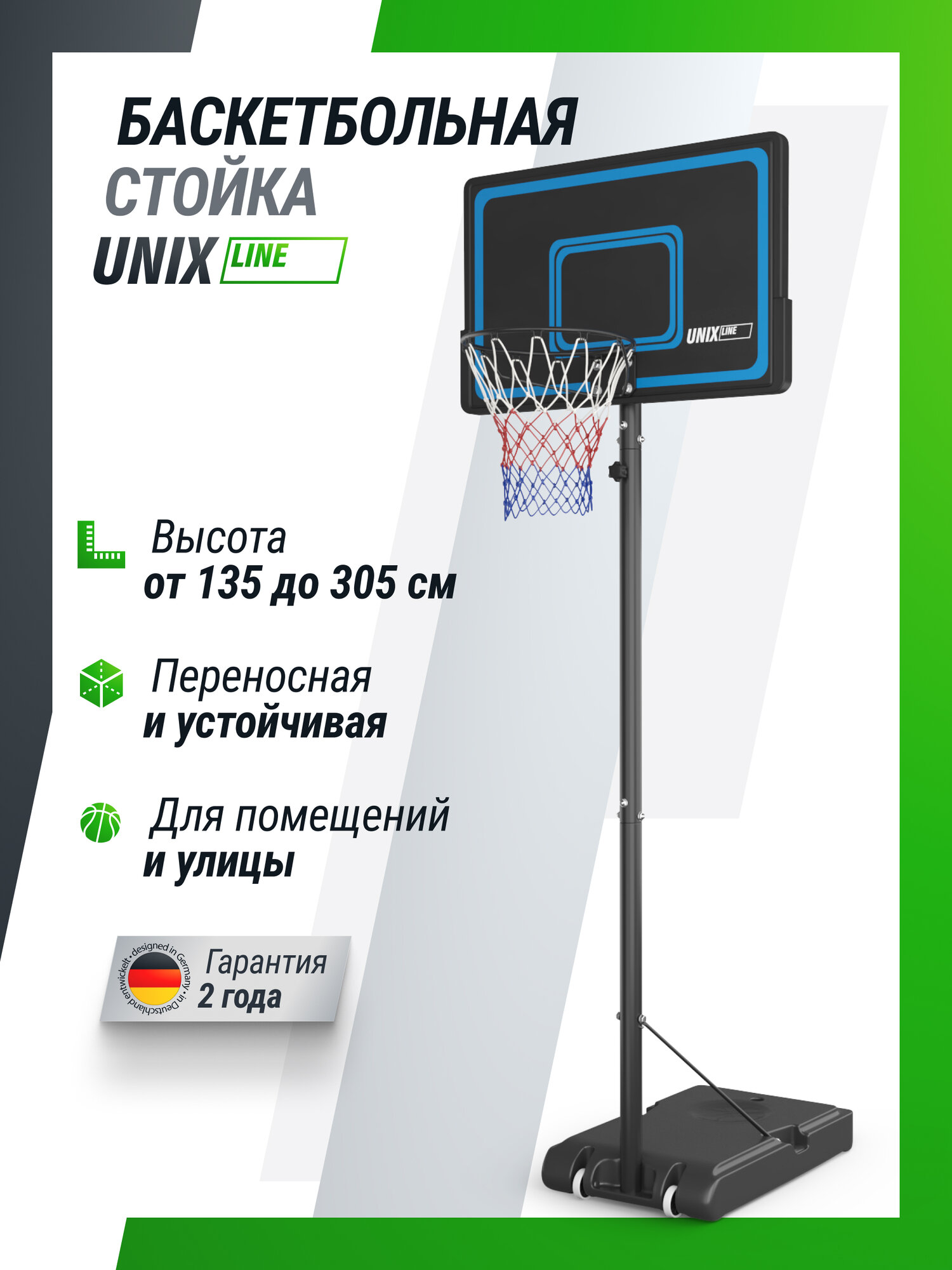 Баскетбольная стойка UNIX Line B-Stand-PE с регулировкой высоты 135-305 см, щит 110х70 см (44"x 28"), диаметр кольца R45 информация: