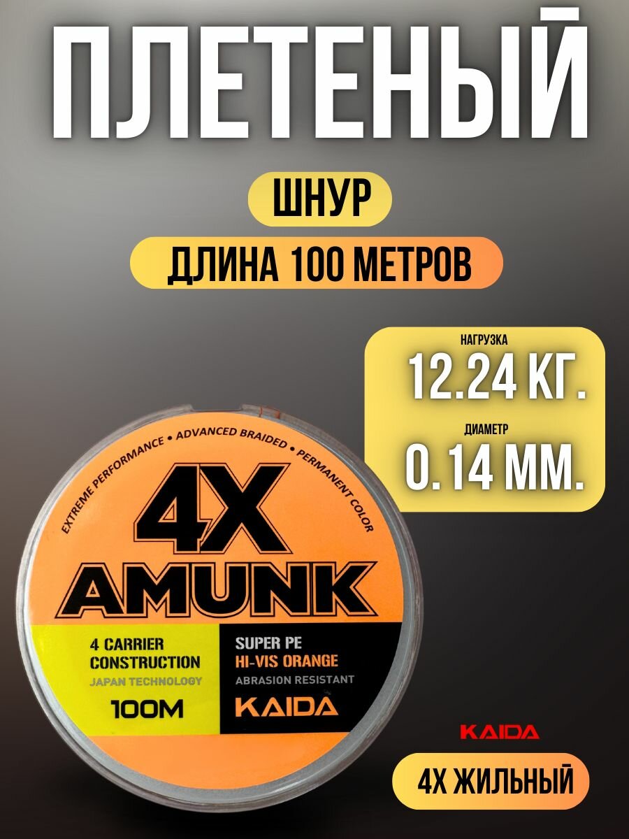 Плетеный шнур для рыбалки / леска плетенка для спиннинга и фидера Kaida 4X Amunk 100 м 0,14 мм оранжевый информация: