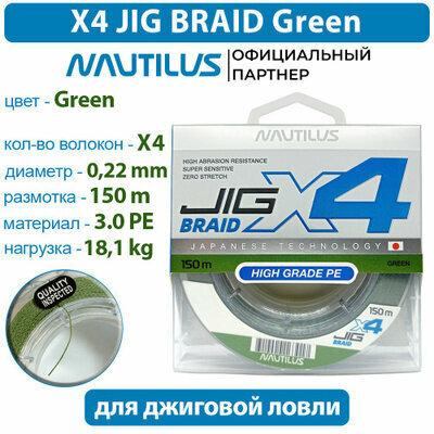 Шнур Nautilus X4 Jig Braid Green d-0.22мм 18.1кг 3,0PE 150м информация: