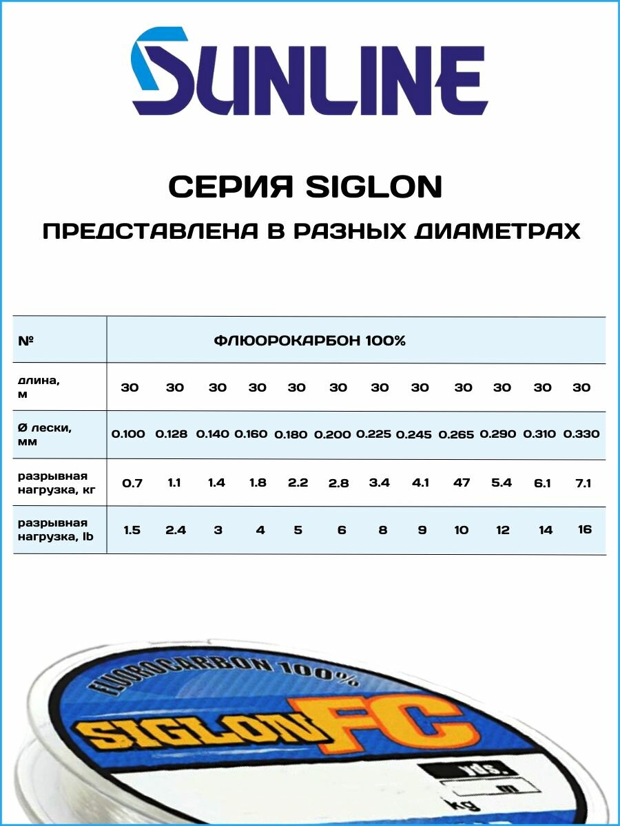SIG-FC 0.100 mm 30m #0.3 Флюорокарбон Sunline 0,7кг 1,5lb поводковый, бесцветная леска 600 ₽