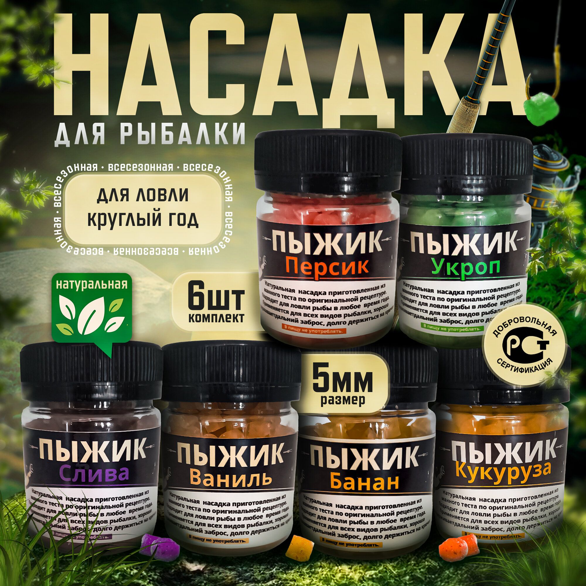 Отзывы на Насадка для рыбалки "Пыжик 5мм", 6 штук, вкус - персик, укроп, слива, ваниль, банан и кукуруза