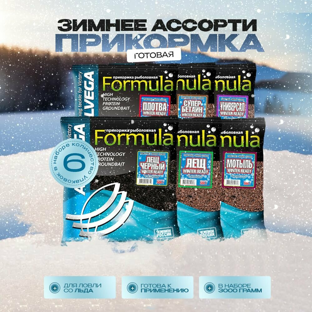 Набор ассорти готовой прикормки для зимней рыбалки ALLVEGA Formula Winter Ready 6 штук по 0,5 кг информация: