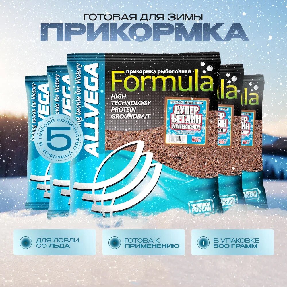 10 цен на Прикормка для зимней рыбалки готовая ALLVEGA Formula Winter Ready супер бетаин 5 пакетов по 0,5 кг