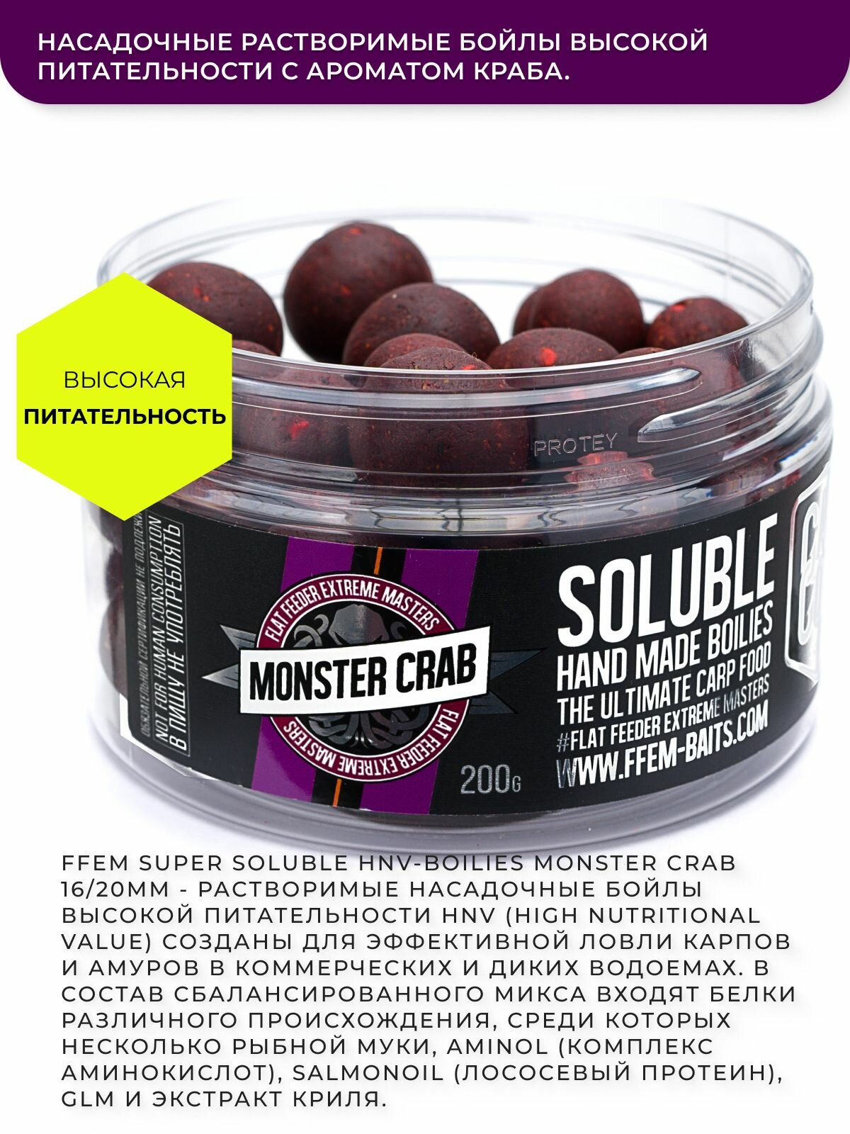 Насадочные пылящие бойлы FFEM Super Soluble Boilies HNV-Monster Crab (краб) 16/20mm информация: