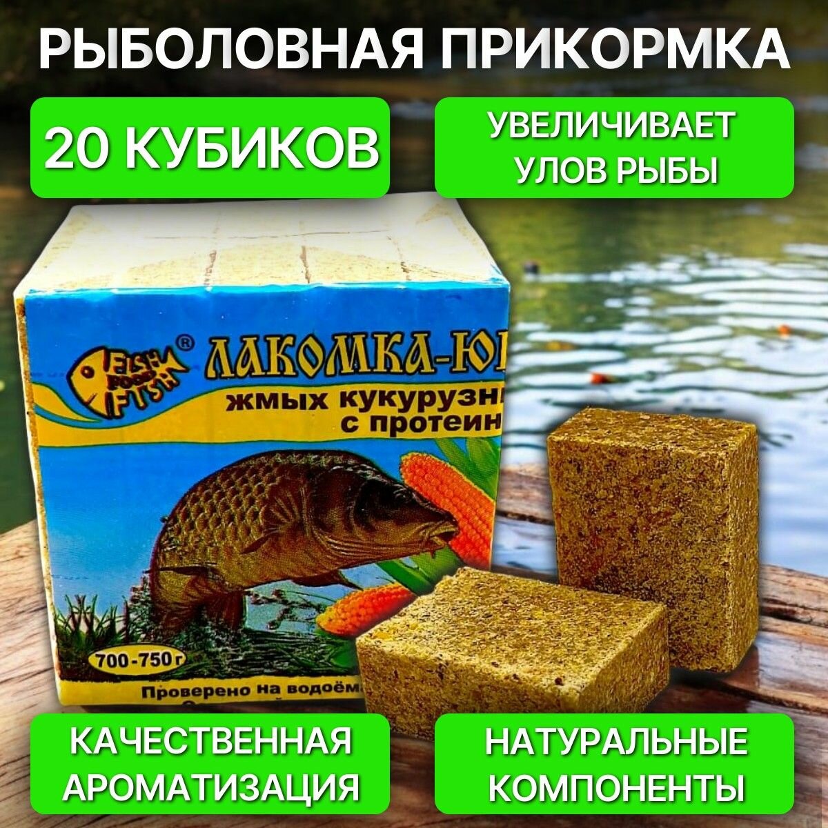 Кукурузный жмых-макуха с отверстиями для крючка набор - Кукуруза, Горох, Чеснок, Мёд, 40 кубиков 1 087 ₽