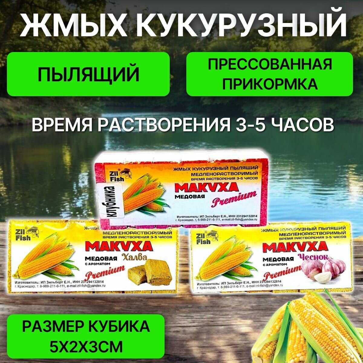 Кукурузный жмых-макуха с отверстиями для крючка набор - Слива, Кукуруза, Горох, Креветка, Чеснок 50 кубиков 1 318 ₽