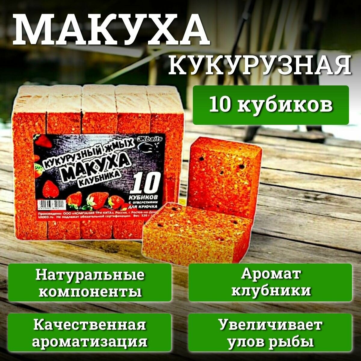 Кукурузный жмых-макуха с отверстиями для крючка "Клубника" 10 кубиков / 320г информация: