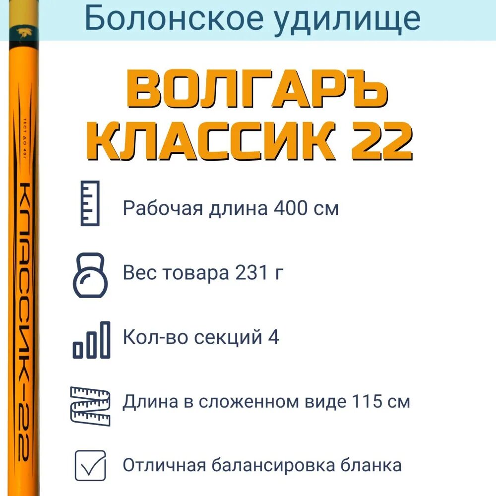 Отзывы на Удилище болонское с кольцами "Волгаръ Классик-22" 4.0м (4 секции) тест до 40гр (композит), удочка на поплавок Волжанка, поплавочная удочка