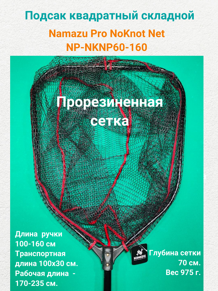 Подсак Namazu Pro NoKnot Net PVC прорезиненная сетка 160см, квадратный складной обод 60см информация: